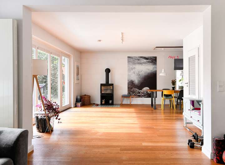 •sehr heller Wohn- und Essbereich mit großer Fensterfront und Kaminofen