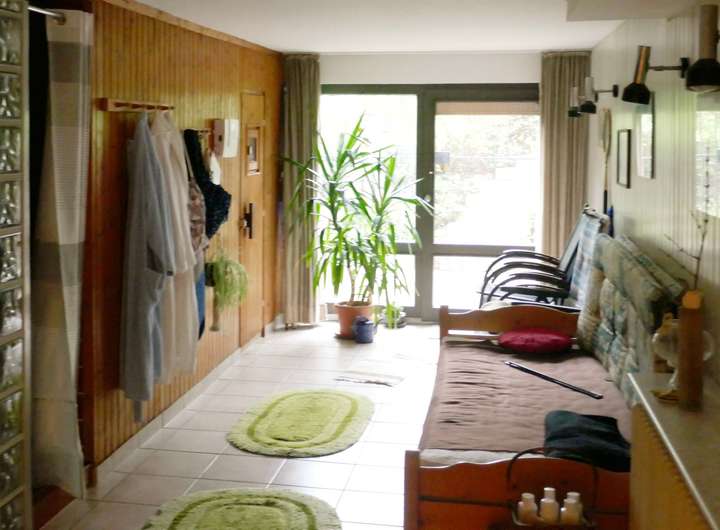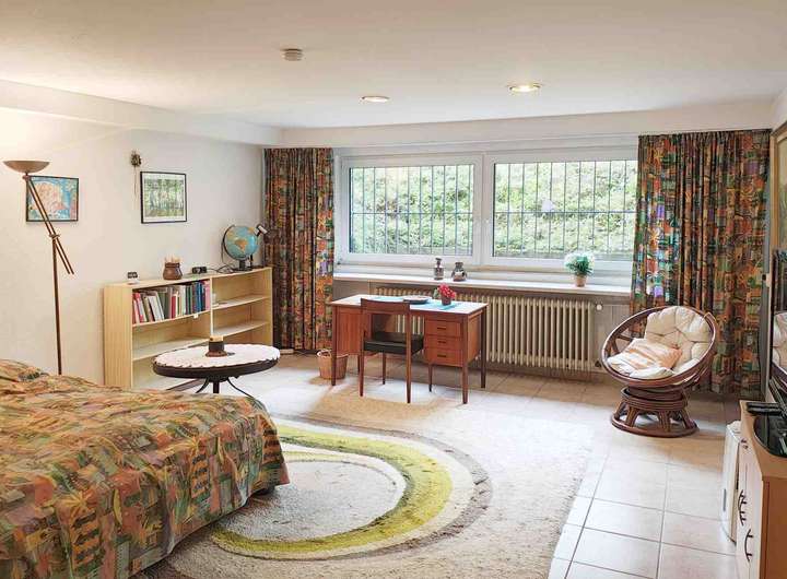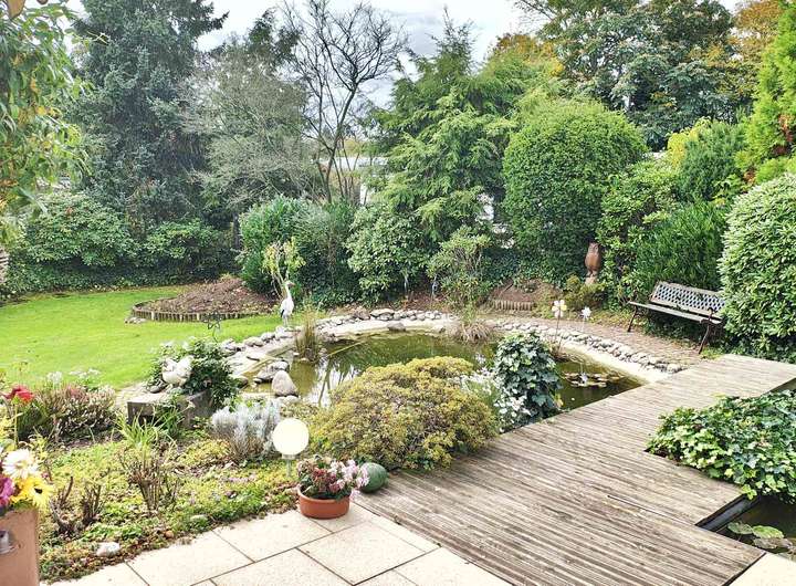 Der hier angebotene Bungalow ist ein Eckhaus mit entsprechend großem Grundstück. Er ist voll unterkellert, wobei fast alle Räume im Untergeschoss wohnlich ausgestattet und auch beheizt sind. Durch die Modellierung des Grundstückes sind an 2 Stellen große Fenster eingebaut worden, so dass die Räume auch über Tageslicht verfügen. Hier gibt es ein zusätzliches großes Wohn-/Schlafzimmer, diverse Nebenräume sowie eine Saunaanlage inkl. Tauchbecken. Außerdem kann man von hier direkt in den Garten gehen. Im Garten findet man einen Brunnen sowie einen Außenkamin und einen Zierteich mit kleiner Brücke.