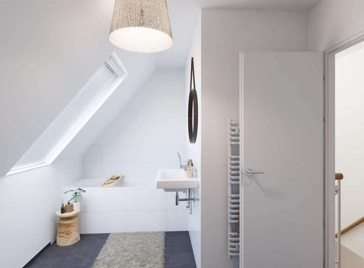 Im Obergeschoss befinden sich die Schlaf- und Kinderzimmer, welche allesamt hell ausgeleuchtet sind und jede Menge Raum für Einrichtung und Privatsphäre bieten. Das modern geflieste Badezimmer überzeugt durch seine Ausstattung mit Badewanne und Dusche und durch das Dachflächenfenster.