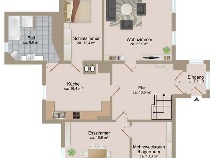 - Bodenbeläge: Laminat, Teppich, Fliesen