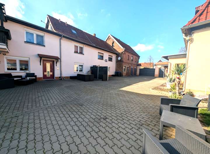 - Großes Einfahrtstor, gepflasterter Hof, Pool