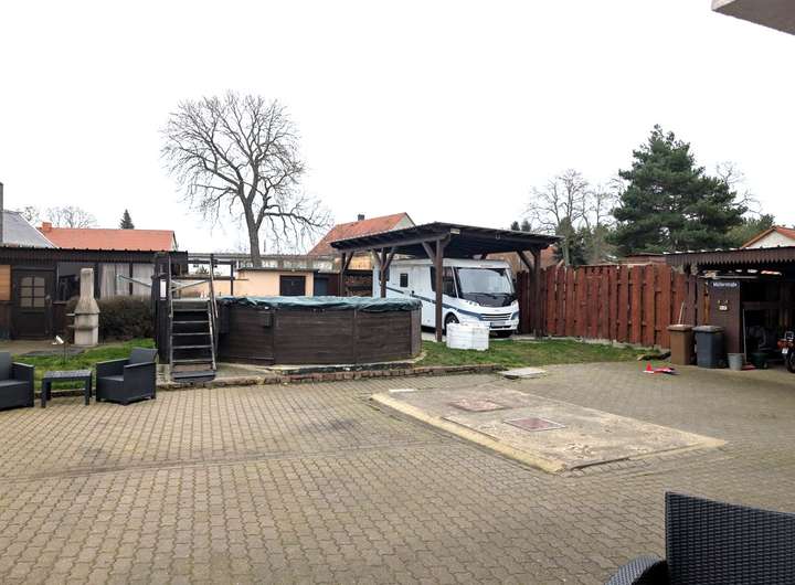 Das großzügige Grundstück überzeugt mit einem gepflegten Gartenbereich, Carport, Hundezwinger, Gartenhaus, Außendusche, Pool und einem gemütlichen Partyraum mit Kaminofen. Eine Garage mit elektrischem Tor sowie weitere Nebengebäude und ein komplett gepflasterter Hof runden das Gesamtbild ab.