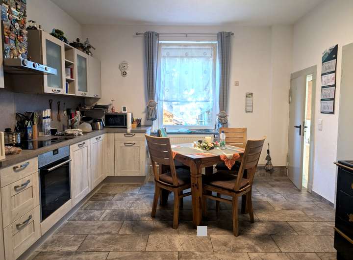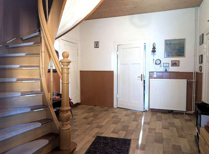 Das Haupthaus (ca. 203 m² Wohnfläche) wurde ca. 1920 erbaut und bietet viel Platz auf zwei Etagen. Es befindet sich in einem gepflegten Zustand und bietet Spielraum für individuelle Modernisierungen. Im Erdgeschoss befinden sich u.a. ein Wohnzimmer, eine Küche, ein Bad, ein separates WC sowie mehrere Wohn- und Nutzräume. Im Obergeschoss verteilen sich fünf Zimmer – ideal für Familien mit großem Platzbedarf.