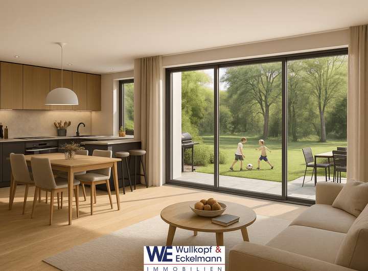 Im Erdgeschoss erwartet Sie ein großzügiger Eingangsbereich mit Platz für eine Garderobe, ein stilvolles Gäste-Duschbad sowie der offen gestaltete Wohn- und Essbereich mit integriertem Küchenbereich. Große Fensterflächen sorgen für ein lichtdurchflutetes Ambiente und schaffen einen harmonischen Übergang zu der Gartenterrasse und dem Garten, der an ein Naturschutzgebiet angrenzt.