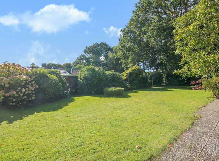 Beim Betreten des Hauses führt ein gerader Flur in einige Bereiche. Geradeaus öffnet sich der großzügige Wohn- und Essbereich, der durch große Fensterfronten viel Tageslicht erhält und einen schönen Ausblick in den Garten bietet. Von hier aus gelangt man auf zwei Terrassen: eine weitläufige Fläche für gemeinsame Stunden im Freien und eine kleinere, die sich als ruhiger Rückzugsort eignet.