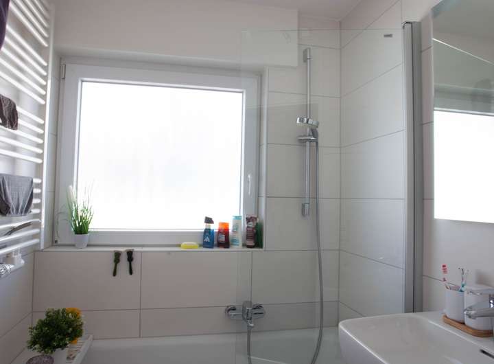 Neues, helles Tageslichtbad mit Badewanne und Handtuchheizkörper