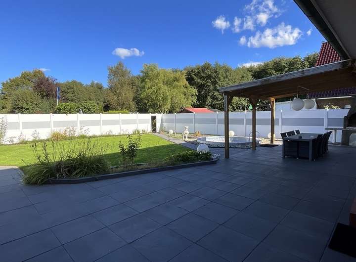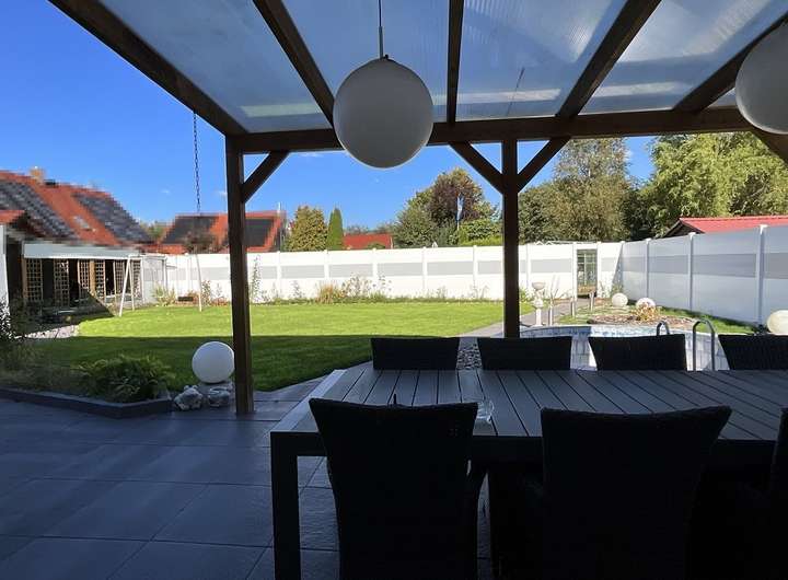 Die sehr große und überwiegend überdachte Terrasse mit tollem Blick in den Garten und einem gemauerten Grillkamin lädt zum Verweilen ein.