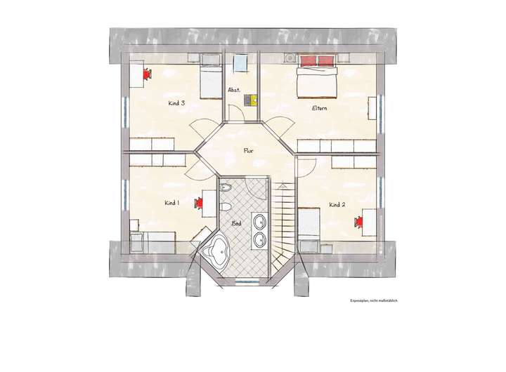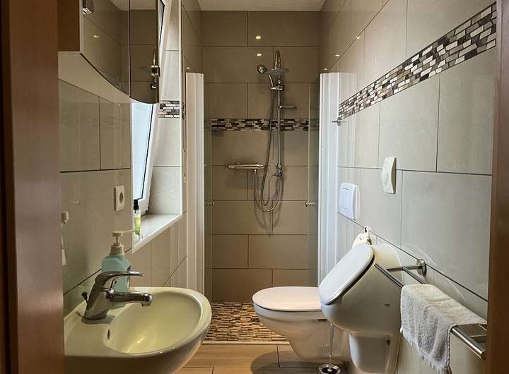 Im Obergeschoss sind 4 Schlafzimmer, ein Badezimmer mit großer Duschwanne und Bidet, sowie ein Abstellraum mit der zentralen Heizungsanlage untergebracht.