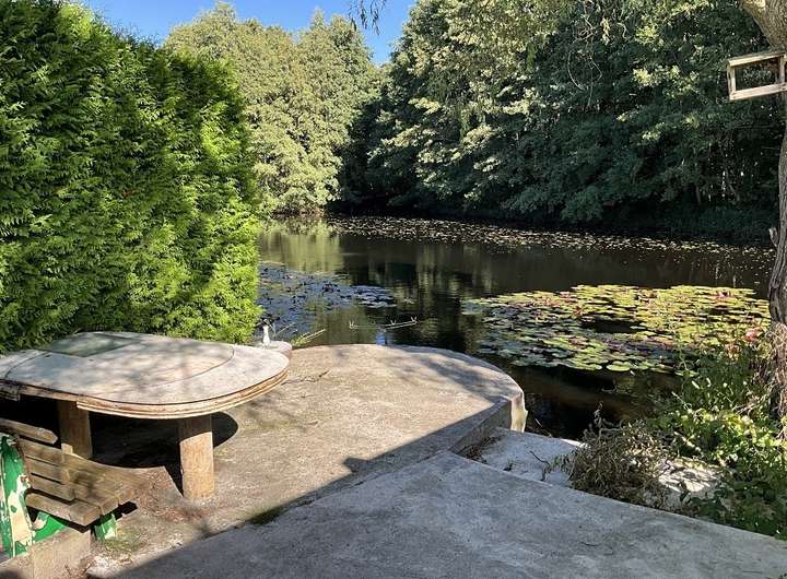 Zudem gibt es eine Teilfläche der Stadt, die zu einem großen Teich hinter dem Haus führt und genutzt werden kann. Hier befinden sich zwei Treibhäuschen, sowie eine gemütliche Sitzbank mit Blick aufs Wasser.