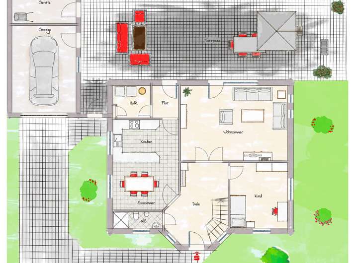 Das gepflegte Haus mit außergewöhnlichen Ausstattungsmerkmalen steht auf einem pflegeleicht angelegten und uneinsehbaren Grundstück.