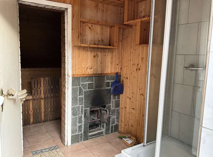Hinter der Garage befindet sich ein separater Saunabereich mit eigener Dusche. Ein kleiner gefliester Pool sorgt anschließend für die notwendige Erfrischung.