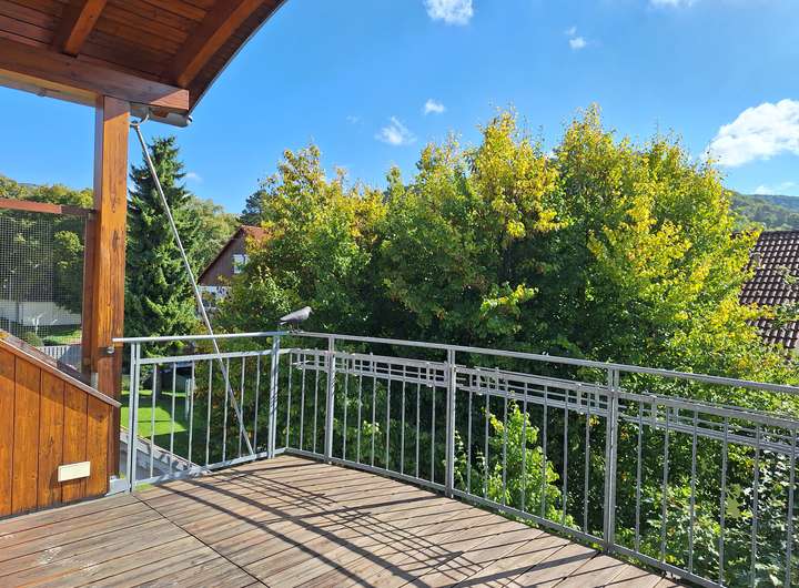 Vom Wohn- und Essbereich aus gelangen Sie auf den teilweise überdachten Balkon, der einen herrlichen Blick über die Umgebung bietet - perfekt, um den Feierabend in Ruhe zu genießen.