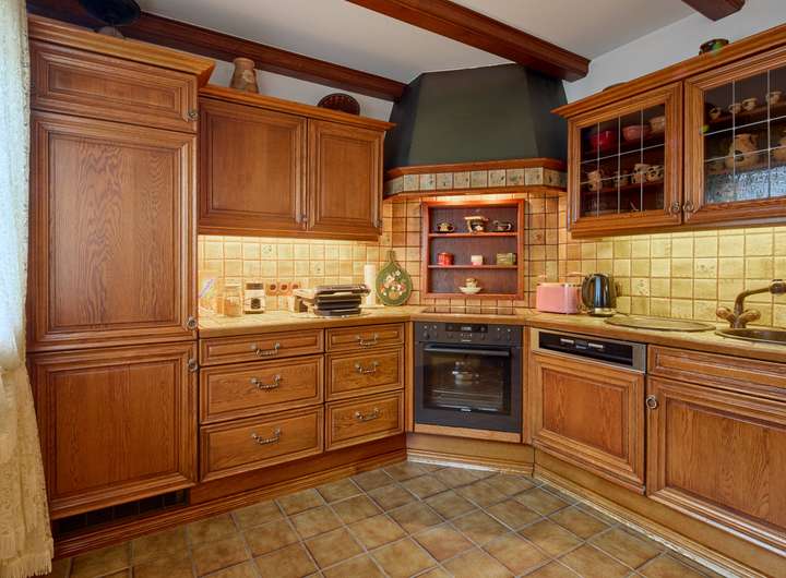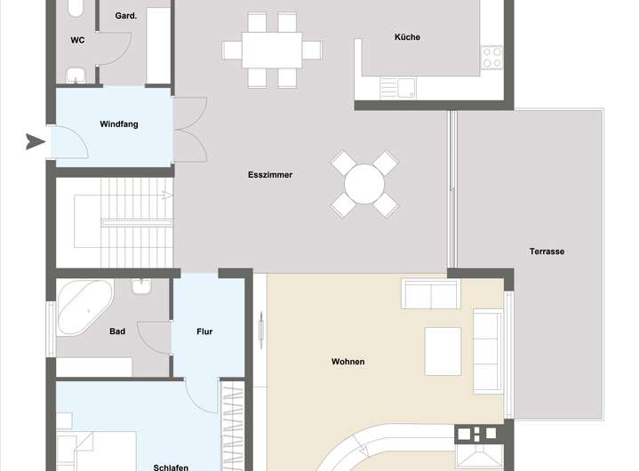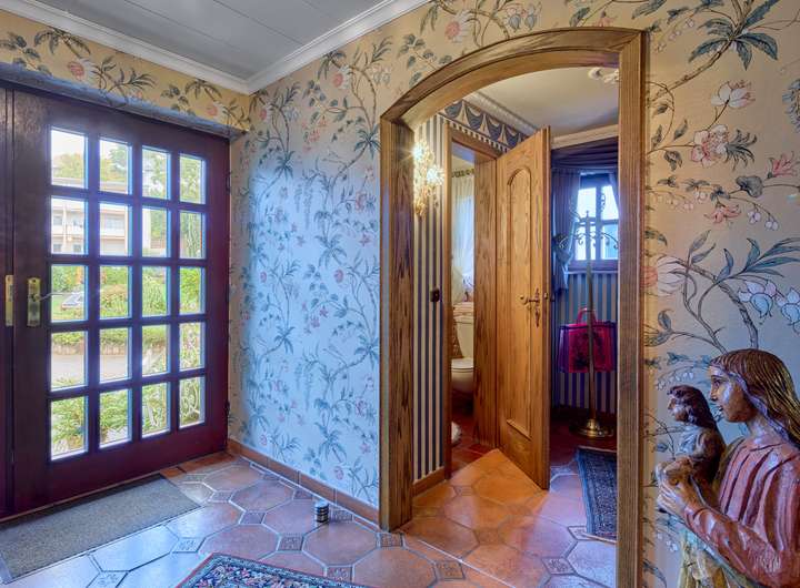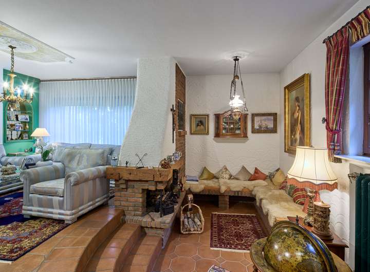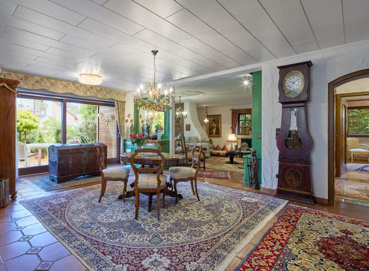Über eine vierstufige Treppe gelangt man in das einladende Entree, das durch eine angrenzende Gäste-Toilette und eine geräumige Garderobe ergänzt wird. Durch eine Doppelflügeltür tritt man in den großflächigen Essbereich sowie eine großzügig geschnittene Küche. Wer gern kocht, der ist hier gut aufgehoben. Der Essbereich mündet rechter Hand in den großen Wohnbereich mit Zugang zur uneinsehbaren Terrasse mit südlicher Ausrichtung und dem liebevoll gepflegten Garten. Eine gemütliche Kaminecke sorgt zusätzlich für eine behagliche Atmosphäre an kühleren Tagen.