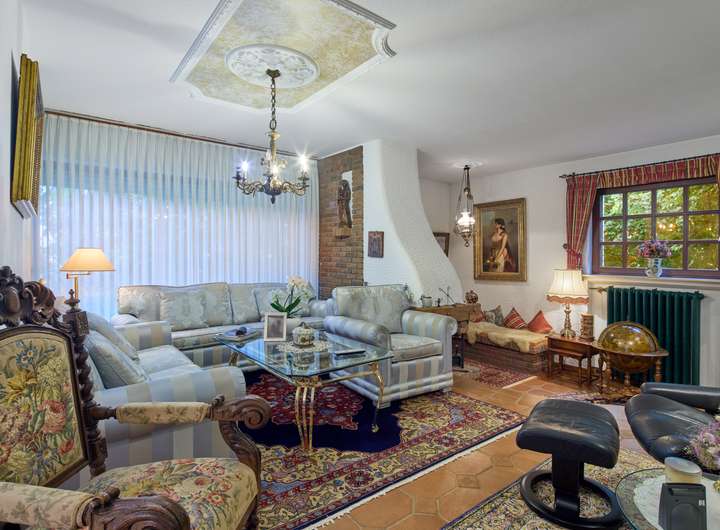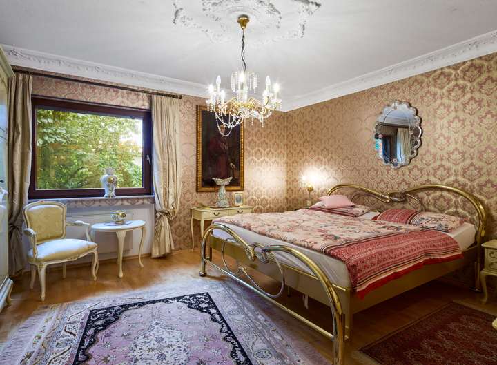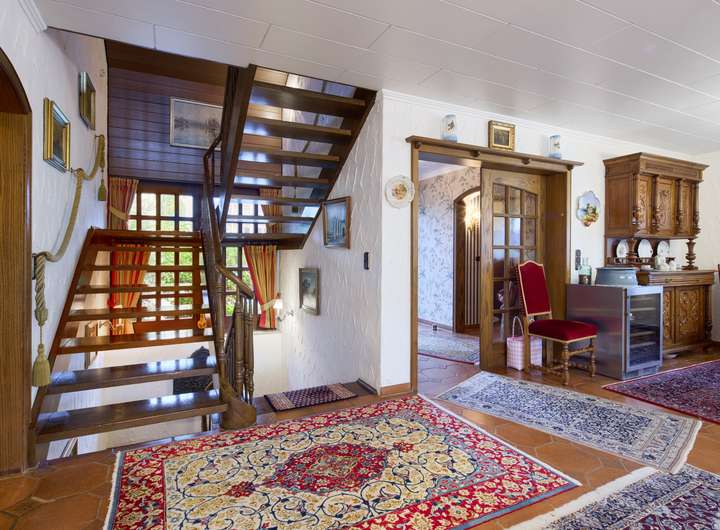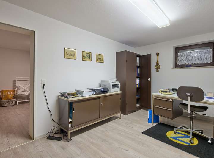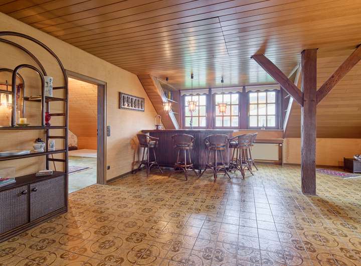 Auf dieser Etage befindet sich außerdem ein abgeschlossener Schlafbereich mit einem stilvollen Schlafzimmer und einem Badezimmer, das mit einer komfortablen Badewanne ausgestattet ist. Im Obergeschoss öffnet sich ein großzügiger Raum mit Barbereich und einer behaglichen Sitzgruppe. Von dort gelangt man bequem auf den Balkon, der in südwestlicher Richtung ausgerichtet ist. Darüber hinaus stehen drei weitere Räume zur Verfügung, die flexibel als Schlafzimmer, Kinderzimmer oder Home Office genutzt werden können. Im Souterrain befindet sich neben einer Sauna, einem Büro, diverser Lager- und Nutzräume, die ca. 35 m² große Einliegerwohnung mit einem Wohn-/Essbereich, einem Duschbad und einer Kitchenette. Zu diesem Haus gehören 4 Garagen und diverse Stellplätze. Haben wir Ihr Interesse geweckt? Dann freuen wir uns auf Ihre Kontaktaufnahme.