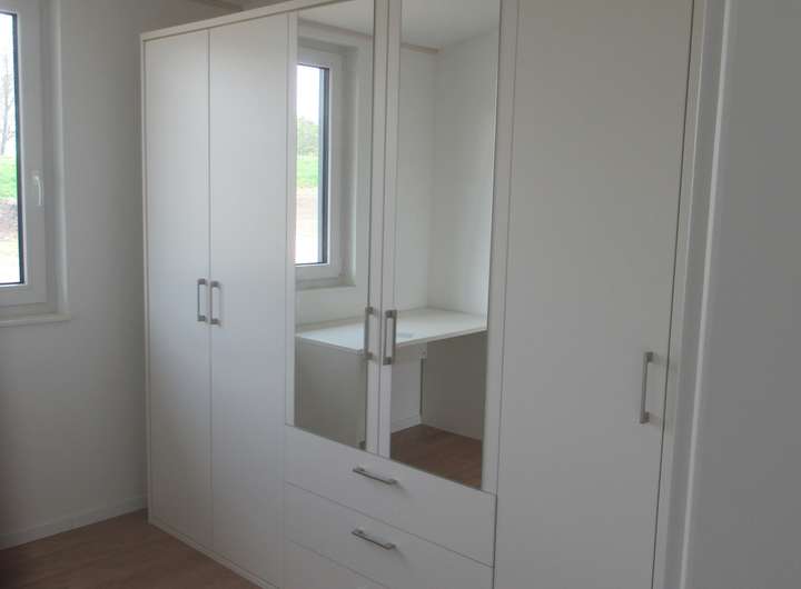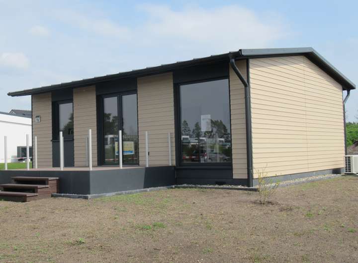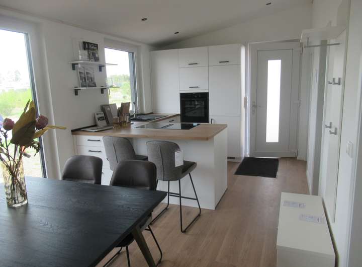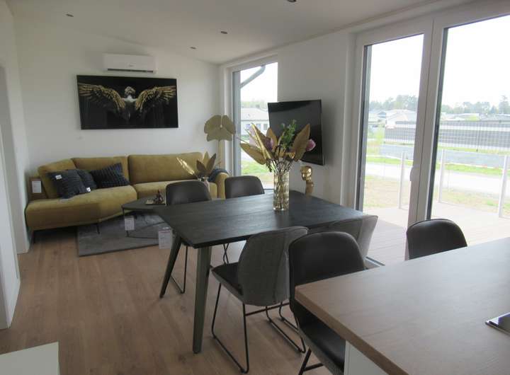 Dieses moderne Modulhaus im Bungalow-Stil besticht durch seine hochwertige Ausstattung, klare Linienführung und eine durchdachte Raumaufteilung auf einer Ebene. Große, bodentiefe Fenster sorgen für lichtdurchflutete Räume und schaffen eine angenehme Verbindung zwischen Innen- und Außenbereich.