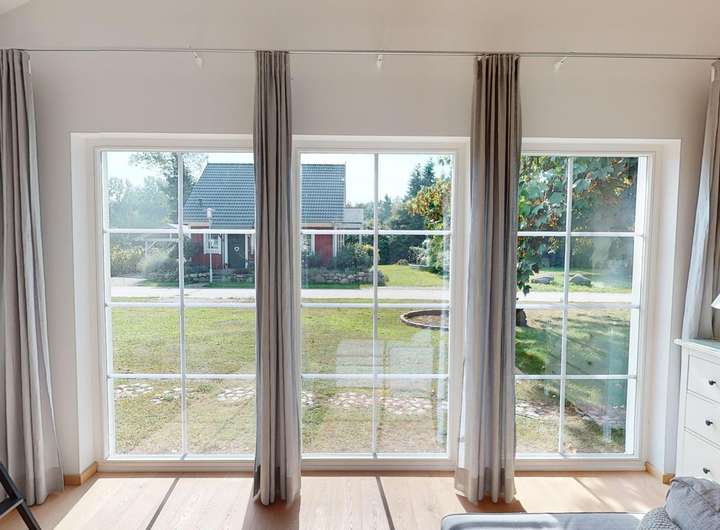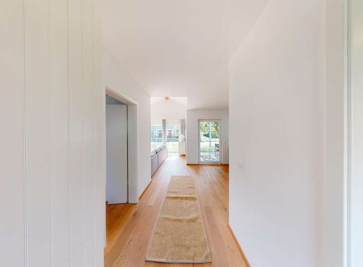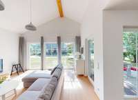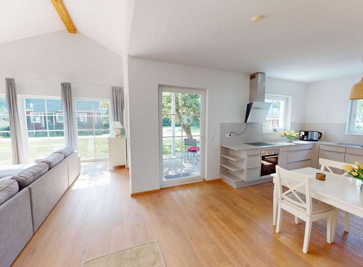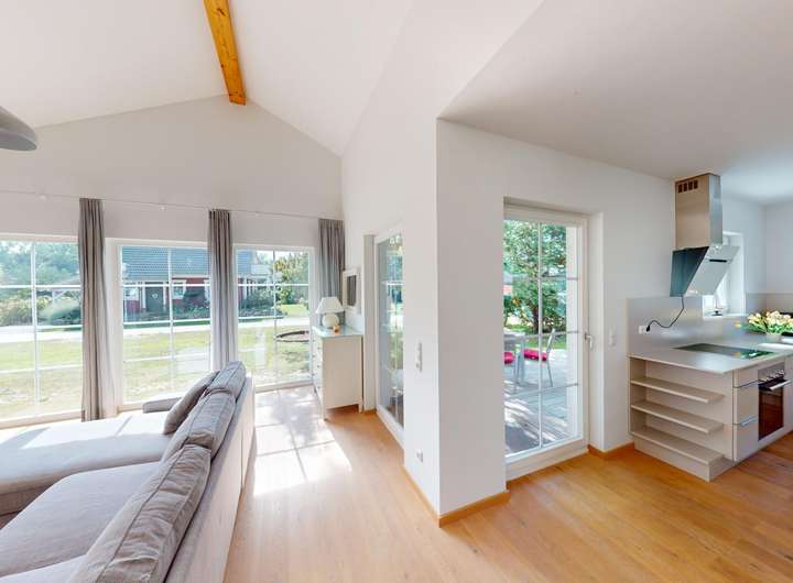 Weiter geradeaus gelangen Sie in den großen, offenen Wohn- und Küchenbereich. Dieser Bereich verfügt über besonders viele und hohe Fenster. Diese sorgen für reichlich Tageslicht und schaffen eine warme und einladende Atmosphäre.