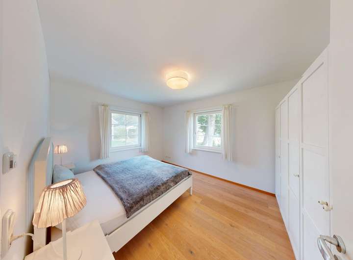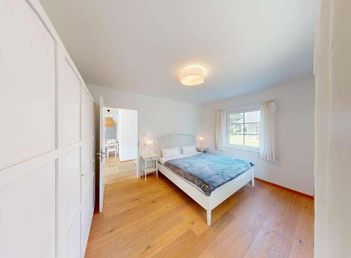 Zur linken Seite befindet sich das Schlafzimmer. Es bietet viel Raum, um Ihre Wohnträume zu verwirklichen. So lassen sich problemlos ein Kíngsize Bett, zwei Nachttische, ein großer Kleiderschrank und Sideboards aufstellen. Es ist wie der Wohnbereich mit hochwertigem und wohnlichem Eichenparkett ausgestattet. Zwei Fenster lassen auch hier viel Tageslicht zu.