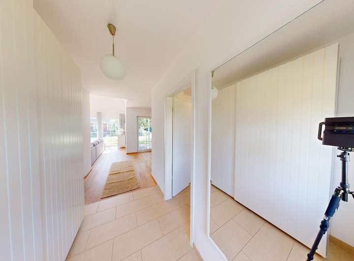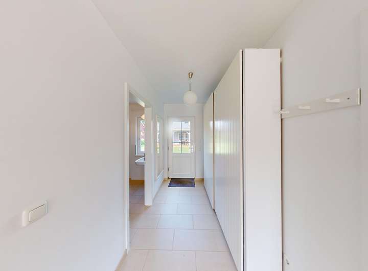Über den Eingang gelangen Sie in die offen geschnittene und geflieste Diele, die ausreichend Platz für einen großen Garderobenschrank, der Stauraum für Ihre Kleidung, Schuhe und Accessoires schafft. Ihre Garderobe bleibt organisiert und stets griffbereit.