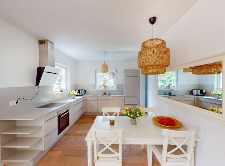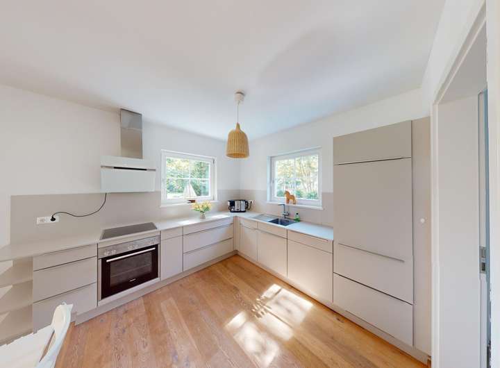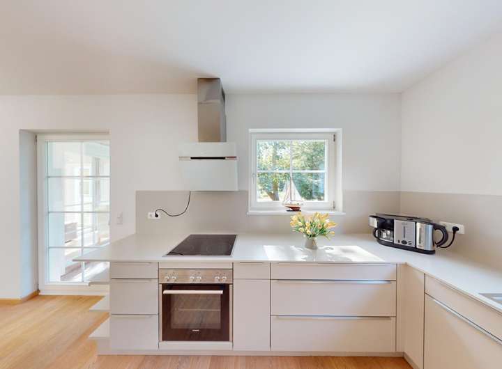 Die ca. 3 x 3 Meter große Einbauküche bietet alle Annehmlichkeiten die Sie für ausgiebige Kochabende benötigen. Sie ist mit hochwertigen Siemens Einbaugeräten ausgestattet und bietet viel Arbeitsfläche und Stauraum.