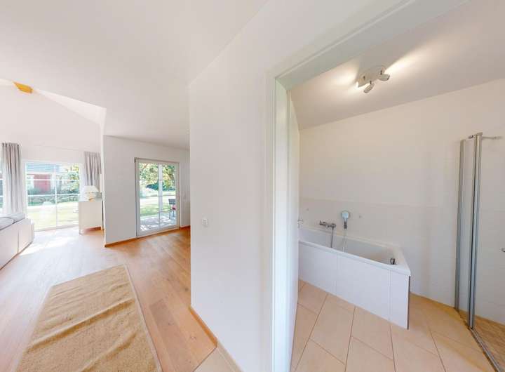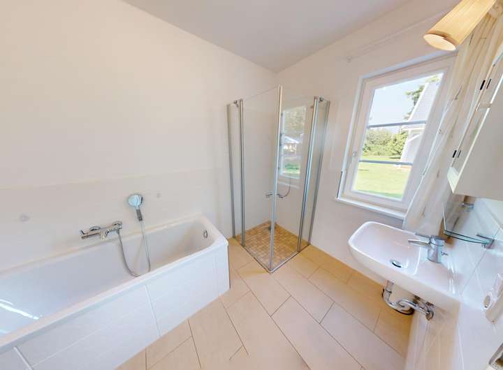 Auf der rechten Seite befindet sich das mit modernen Fliesen gestaltete Badezimmer. Die große Badewanne lädt zu entspannten Schaumbädern an kalten Herbstabenden ein. Zudem verfügt das Bad über eine Echtglasdusche, ein WC und ein Waschbecken.