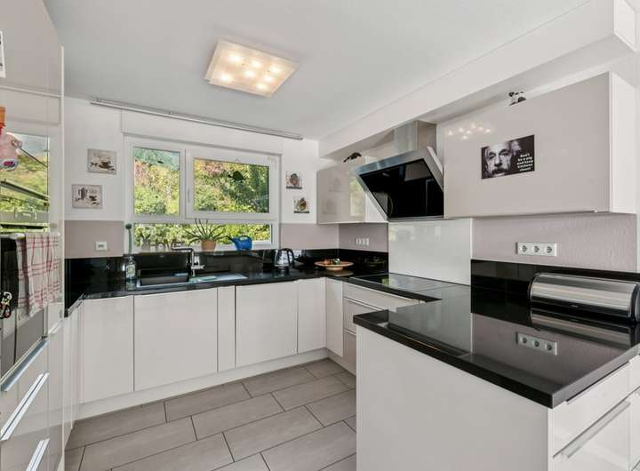 • Hochwertige Einbauküche mit modernen Elektrogeräten und schwarzer Steingranitplatte