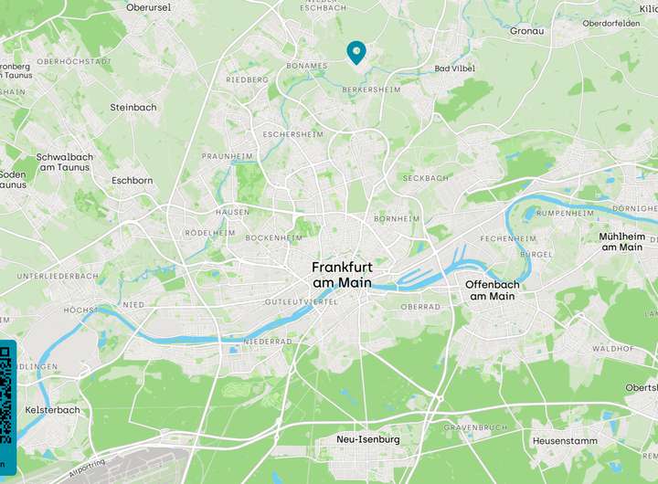 Die nächste Busverbindung ist fußläufig in wenigen Minuten erreichbar und bietet regelmäßige Anschlüsse an die S-Bahn-Station Frankfurt-Berkersheim (Linie S6). Von dort aus gelangen Sie in etwa 15 Minuten direkt in die Frankfurter Innenstadt sowie zum Hauptbahnhof. Zudem fahren Buslinien in kurzer Taktung zur U-Bahn-Stationen Bonames und Kalbach (Linie U2, U8), die eine schnelle Verbindung Richtung Innenstadt und zum Südbahnhof ermöglichen. Über die nahegelegene B3 sowie die Autobahnen A661 und A5 besteht darüber hinaus eine hervorragende Anbindung an das überregionale Straßennetz.