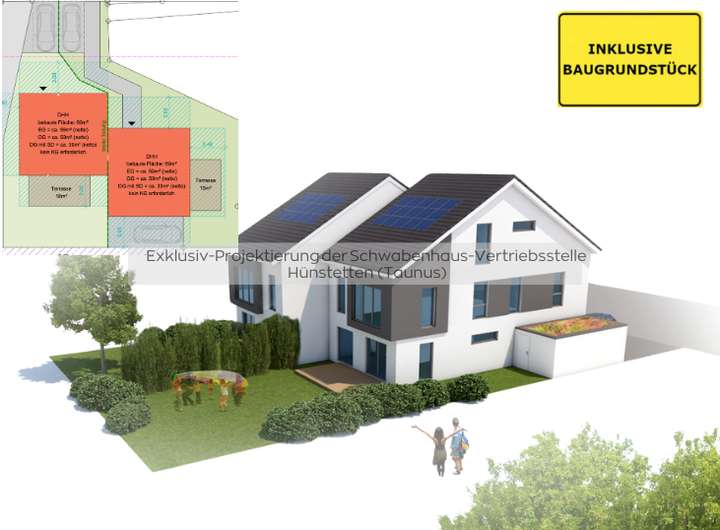 Hier können Sie als Bauherr die Hausbau-Firma SCHWABENHAUS mit der Errichtung eines energieeffizienten Hauses mit Festpreisgarantie und zeitnaher Fertigstellung beauftragen und Ihre Bauwünsche INDIVIDUELL auf einem wunderschönen Baugrundstück verwirklichen, welches Sie vorher direkt „von privat“ erwerben würden. -- Die hier dargestellten Pläne / Grundrisse stellen eine mögliche Bebauung des Grundstücks dar.