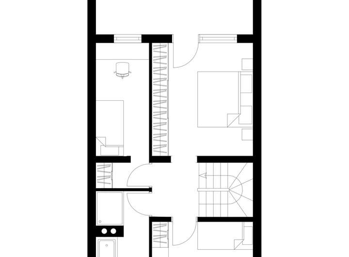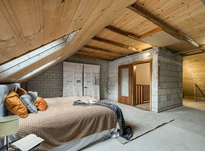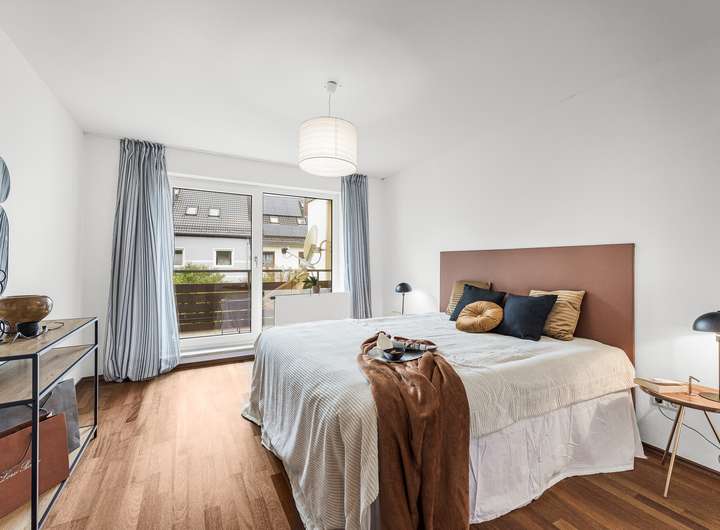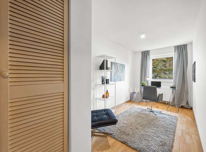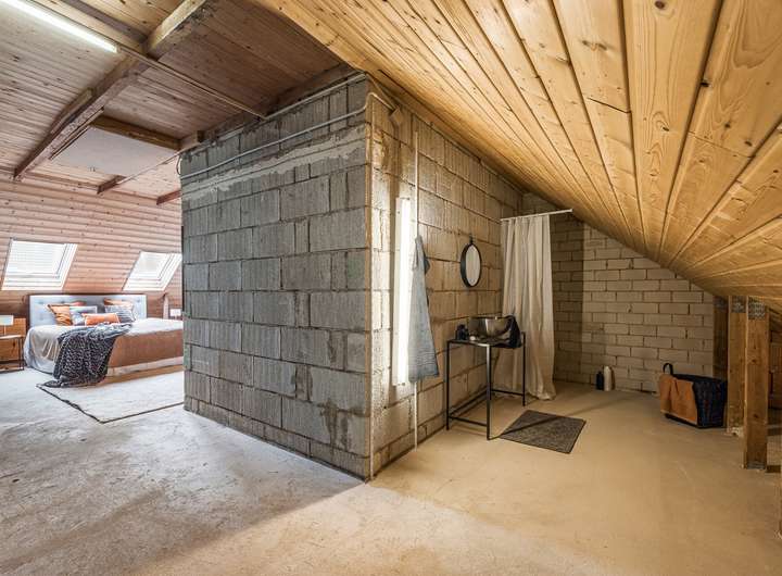 Das Dachgeschoss wurde zu Präsentationszwecken mit Homestaging als Schlafbereich mit Bad und Ankleide eingerichtet, das Bad ist jedoch noch nicht realisiert.
