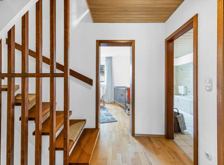Im Obergeschoss erwarten Sie drei gut geschnittene Schlafzimmer sowie ein großzügiges Badezimmer mit Badewanne und Dusche – ideal, wenn sich morgens mal wieder alle gleichzeitig fertig machen müssen.