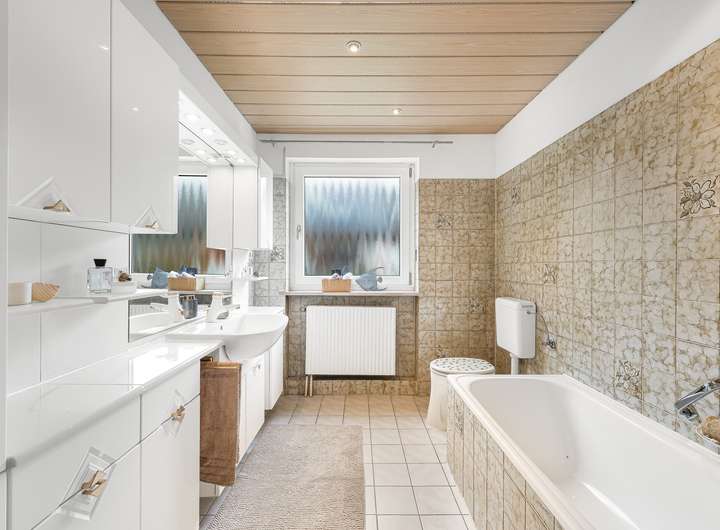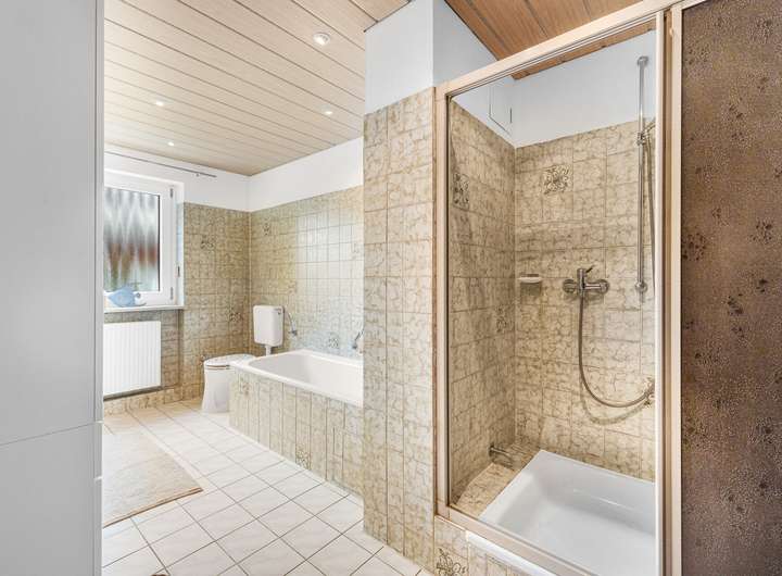 + geräumiges Badezimmer mit Wanne und Dusche