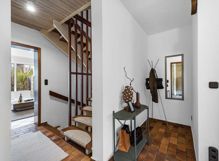Im Erdgeschoss werden Sie von einem einladenden Eingangsbereich empfangen, der ausreichend Platz für Jacken, Schuhe und Alltagsutensilien bietet. Von hier gelangen Sie in die Küche mit Einbauküche sowie in den hellen Wohn- und Essbereich. Große Fensterflächen öffnen den Blick in den liebevoll eingewachsenen Garten – ein idyllischer Rückzugsort für gemütliche Sommerabende, zum Spielen oder Entspannen im Grünen. Ein praktisches Gäste-WC ergänzt das Raumangebot auf dieser Ebene.