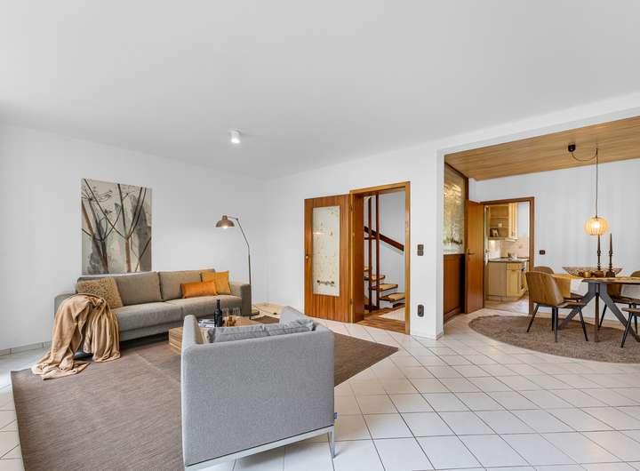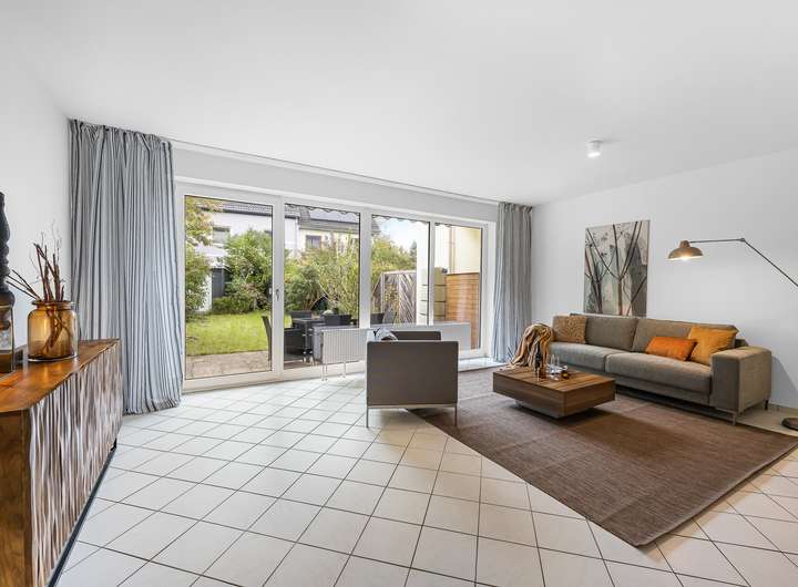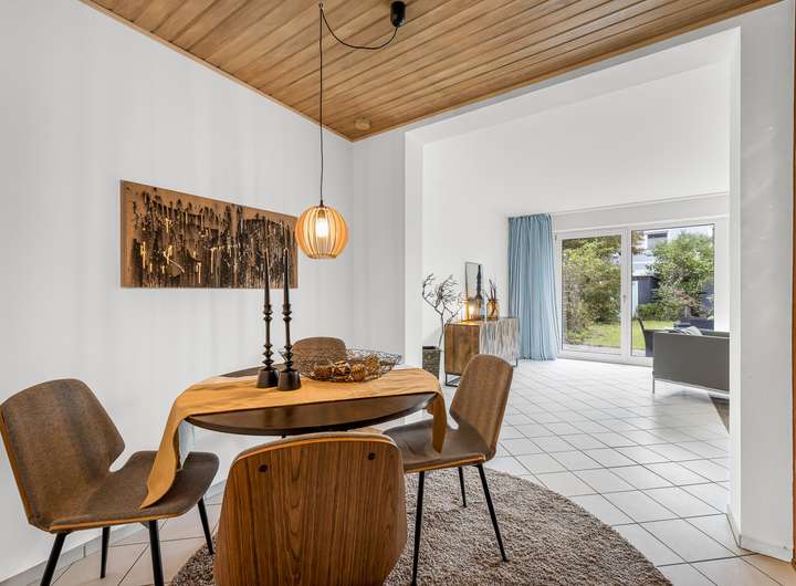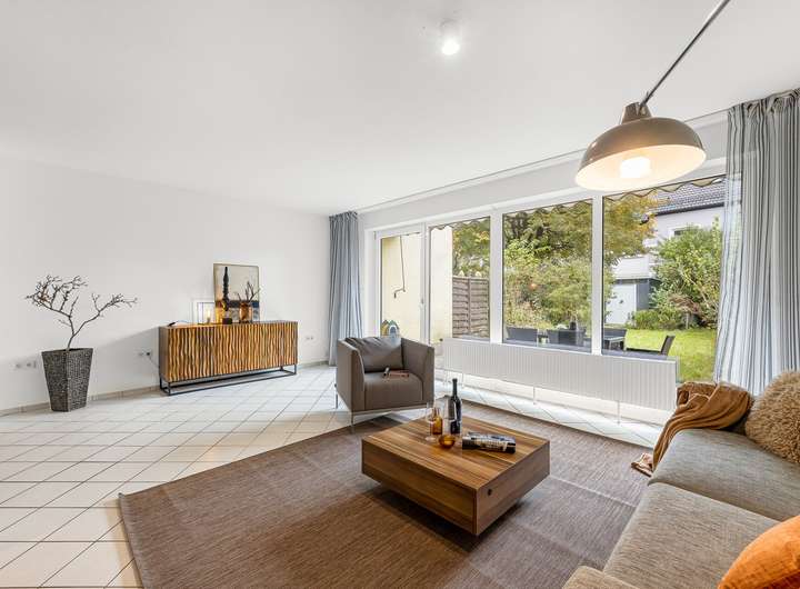 + heller Wohn-Essbereich mit großen Fensterfronten zum Garten