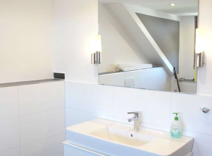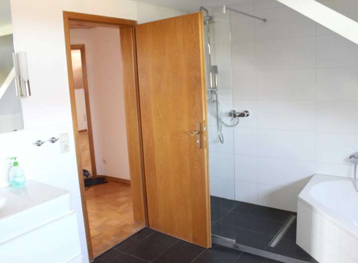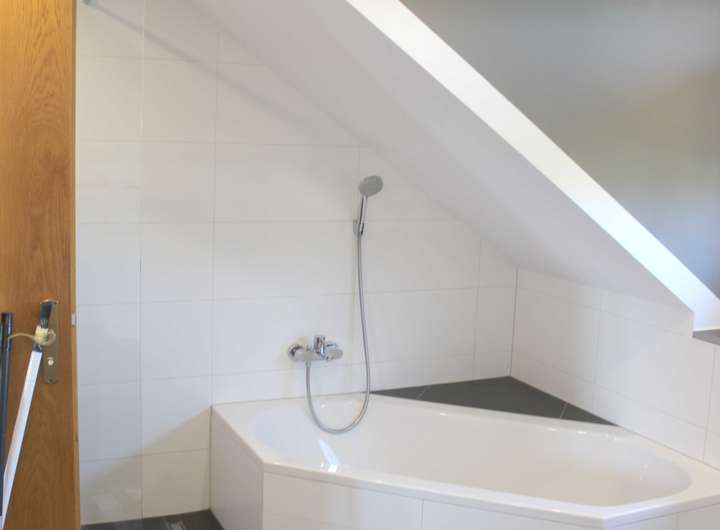 • Helles Tageslichtbad (Badewanne, großzügige Dusche, WC, breites Einzel-Waschbecken – renoviert 2021) mit Gaube und Doppelfenster. Ablagefläche seitlich vorhanden.3D-Ansicht: https://gallery.roomsketcher.com/360/?gid=27470123&l=de