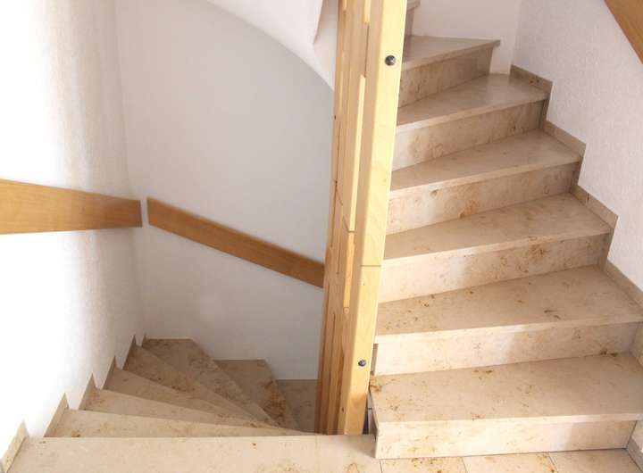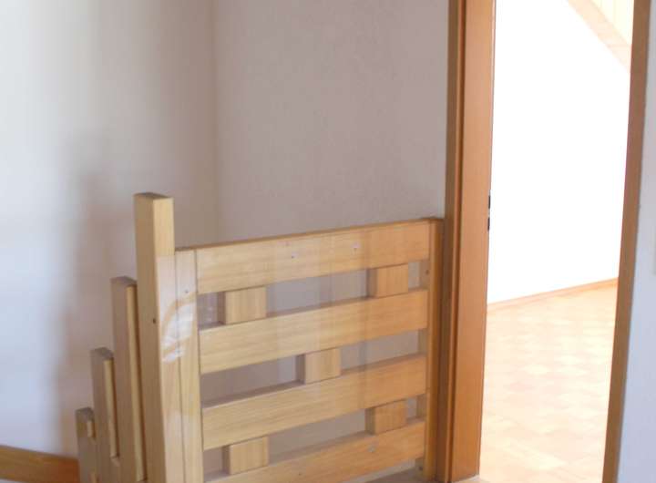 Südwestlich ausgerichtet, hell, Parkett auf allen drei Ebenen (Keller, EG und OG), Jura-Naturstein-Marmor im Gang im EG, Fensterbänke aus Juramarmor, Fenster im Keller aus Kunststoff, sonstige Fenster: Holz – im Schlafzimmer West beide Fenster aus Kunststoff, neu seit 2025. Innentüren in Eiche-Optik, mit Echtholzfurnier / Messingbeschlägen., Treppengeländer Massivholz in heller Ausführung.