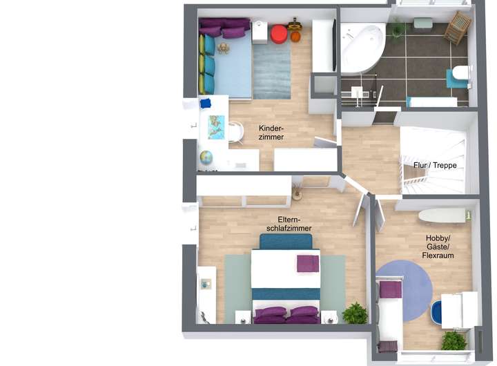 3D-Abbildungen: Hier ohne Einbauten der Vormieter. Möbel dienen der bessaeren Veranschaulichung. Dachschrägen sind in der 3-D-Abbildung nicht abbildbar und können den Fotos entnommen werden.