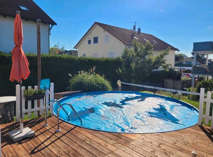 Runder Pool (Ø 5 m), Poolpumpe im separaten Pumpenhäuschen (Pumpe erneuert 2025), Zubehör vorhanden.