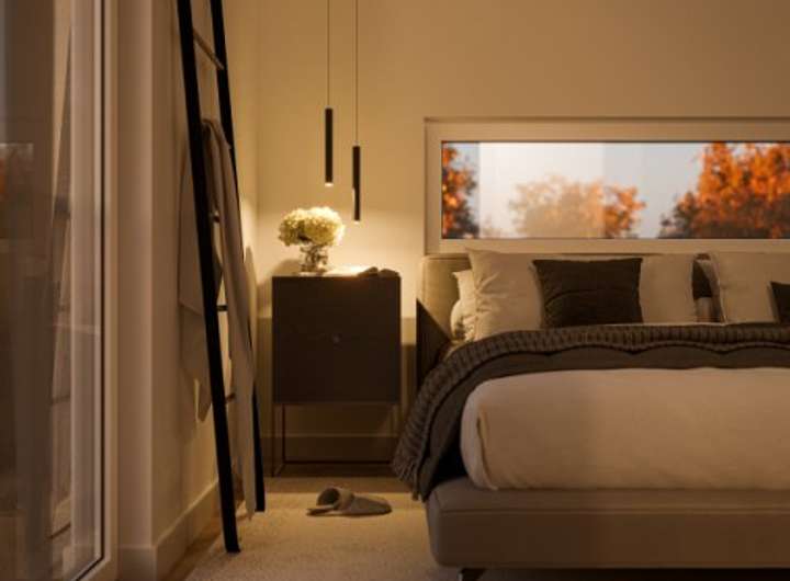 Frisch weht der Hebstwind über die Felder und bringt die goldgelben Blätter zum Rascheln. Was passt besser in diese idyllische Umgebung als ein romantisches Landhaus? Ein Haus mit charakteristischem Zwerchgiebel und weiten Dachüberständen? Kurzum, ein Haus wie dieses moderne Chalet? Ins Auge fällt sofort der Wintergarten-Erker mit Balkon: Mit seiner Holzverschalung setzt er einen angenehmen Akzent zum schlichten, quaderförmigen Baukörper, der sich in eine weiße Putzfassade hüllt. Das helle Holz strahlt Wärme und Freundlichkeit aus, während es zugleich Bezug auf die nachhaltige Bauweise nimmt. Denn der Naturbaustoff bildet die Grundlage für alle Bien-Zenker Häuser. Ergänzt wird das Erscheinungsbild durch großflächige Verglasungen auf beiden Ebenen, die das Schauspiel der Jahreszeiten als eindrucksvolles Panorama in die Innenräume bringen. Das Raumkonzept des Fertighauses orientiert sich an den Bedürfnissen und Gewohnheiten einer vierköpfigen Familie. Lebensmittelpunkt ist das Erdgeschoss, wo sich der großzügige Wohn-, Ess- und Kochbereich befindet, der sich bis in den luftigen Erker hinein erstreckt - der perfekte Platz für einen gemütlichen Ohrensessel oder einen Schaukelstuhl. Durch seine L-Form wird eine direkte Verbindung von Diele und Küche ermöglicht. So muss man nicht erst - vollbepackt mit schweren Einkaufstüten - durch das gesamte Haus laufen, um die Schränke zu erreichen. Über große Fenstertüren schließt sich die Terrasse an, die zum Frühstück unter freiem Himmel einlädt. Die Gemeinschaftsräume nehmen mehr als 33 m² ein. Die restliche Fläche des Erdgeschosses teilen sich ein Technikraum, eine Gästetoilette und eine Garderobe. Über eine platzsparend in das Raumensemble integrierte Treppe gelangt man in das Dachgeschoss, den privaten Rückzugsbereich der Bewohner. Zwei helle Kinderzimmer, ein großer Elternschlafraum mit Ankleidebereich und ein gemütliches Familienbad bieten alles, was man zum Leben und Wohlfühlen braucht.