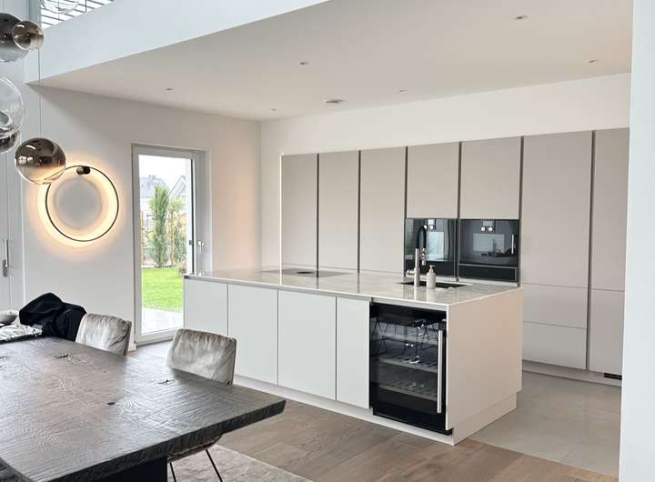 • Voll ausgestattete Einbauküche mit hochwertigen Markengeräten und integriertem Weinkühler