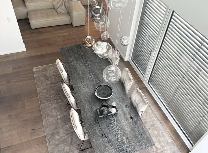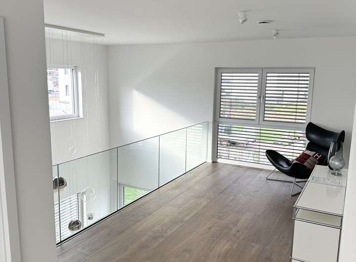 • Großzügige Galerie mit elegantem Glasgeländer, inklusive stilvoller Galerie-Leuchte