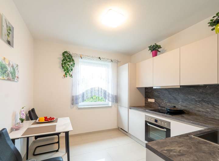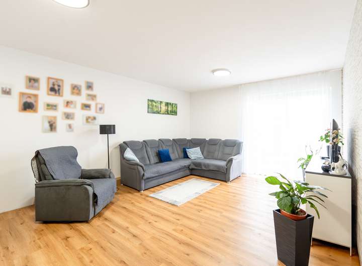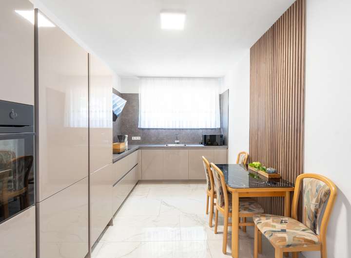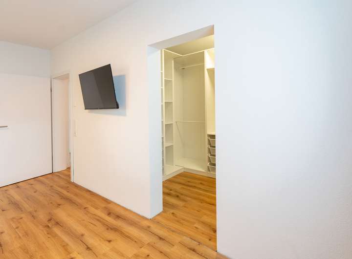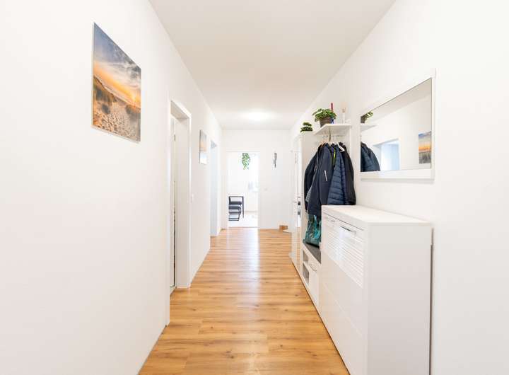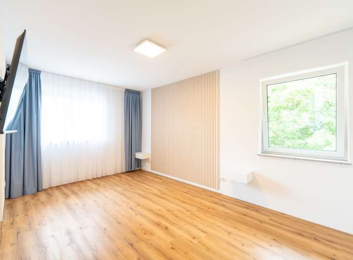 Die separate Einliegerwohnung mit ca. 77 m² ist perfekt für Gäste, Vermietung oder unabhängige Familienmitglieder. Sie umfasst zwei Zimmer, eine Küche mit Speisekammer und ein Bad – kompakt, funktional und einladend.