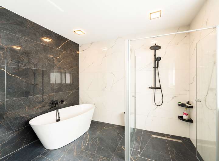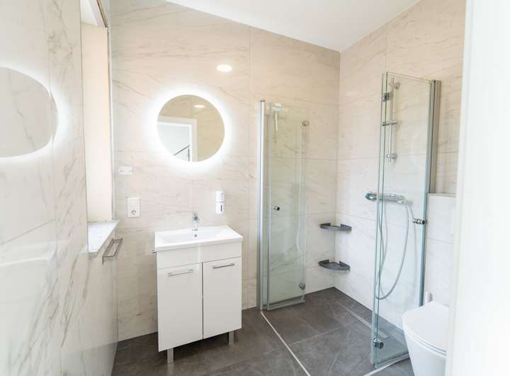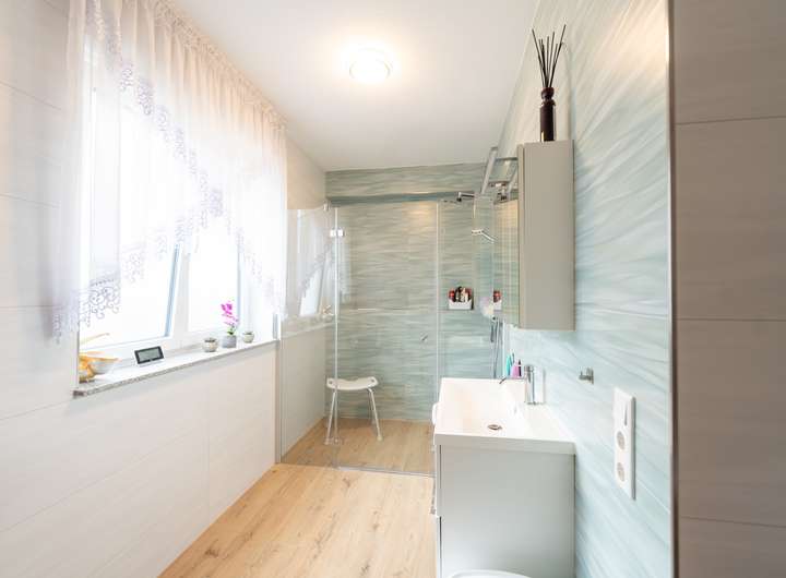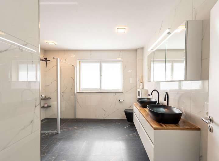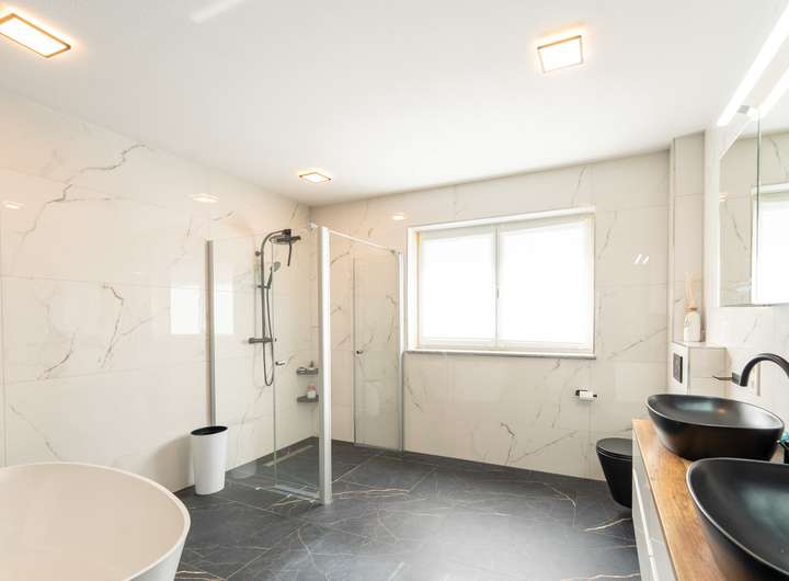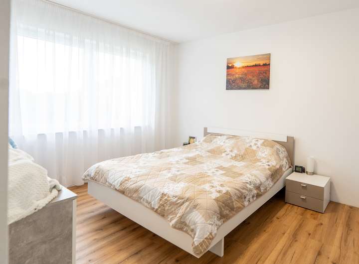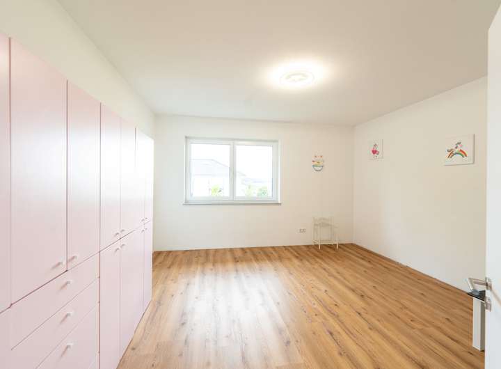 Im Obergeschoss liegen zwei helle Kinderzimmer, das großzügige Schlafzimmer mit Ankleidezimmer und ein flexibel nutzbarer Raum, der derzeit als Hobby- oder Fitnessbereich dient. Das Hauptbadezimmer überzeugt mit edlen Fliesen und stilvoller Ausstattung. Ein weiteres Badezimmer mit Dusche im Erdgeschoss eignet sich ideal als Gäste-WC. Ein Abstellraum und eine Terrasse im Obergeschoss runden das Angebot ab.