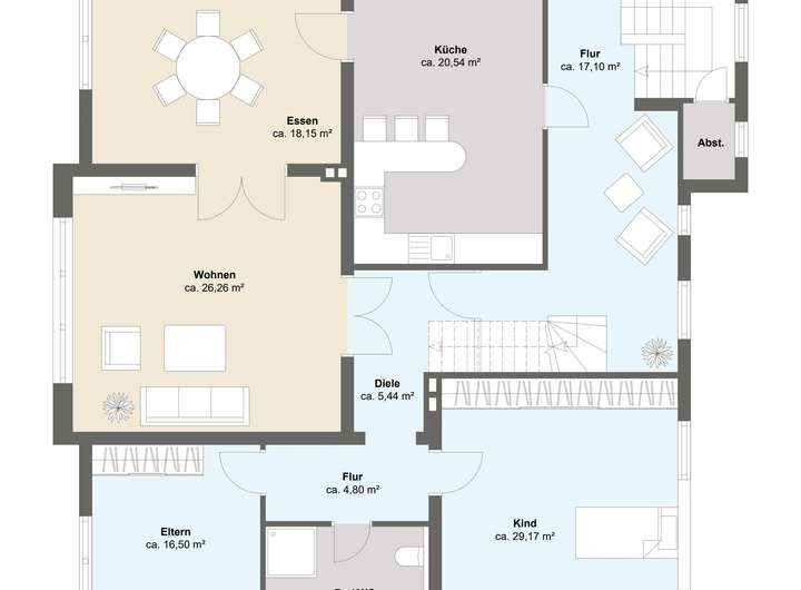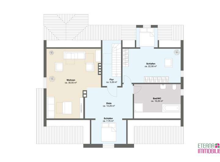 Das Dachgeschoss ergänzt das Wohnkonzept um 1,5 Schlafzimmer, ein weiteres Vollbad sowie eine großzügige Diele, die bei Bedarf flexibel abgetrennt werden kann.