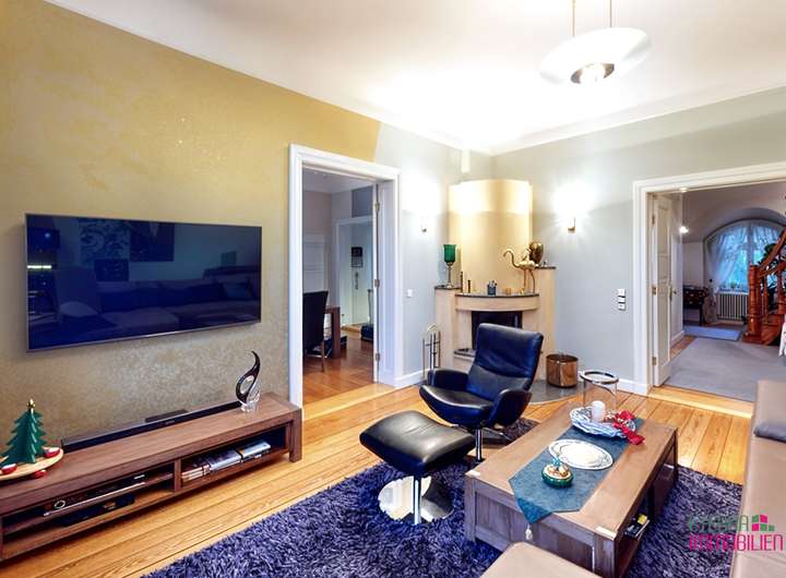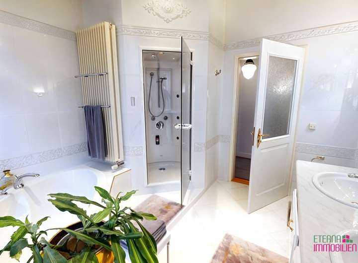 Die Villa wurde 1998 in enger Abstimmung mit dem Denkmalschutz umfassend saniert und entspricht höchsten Komfortansprüchen. Neben dem Heizungs- und Technikraum bietet der Keller zwei Abstellräume sowie eine Tiefgarage mit elektrischem Rolltor für zwei Pkw.