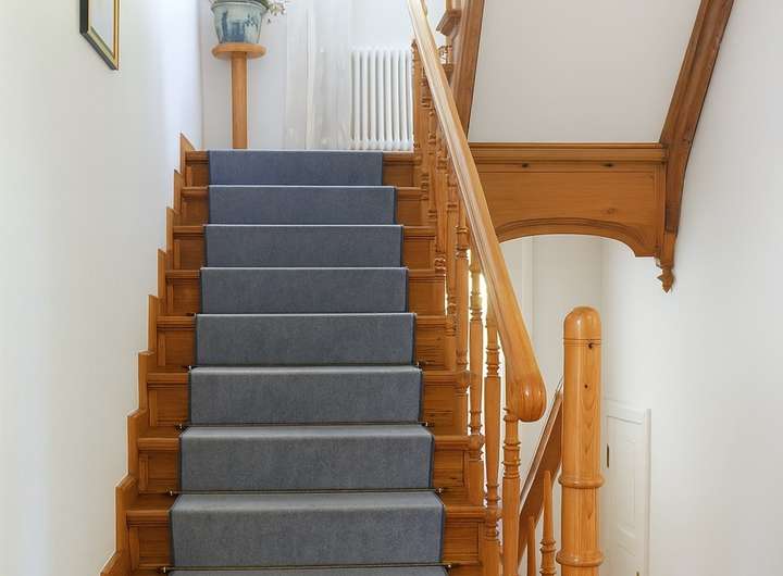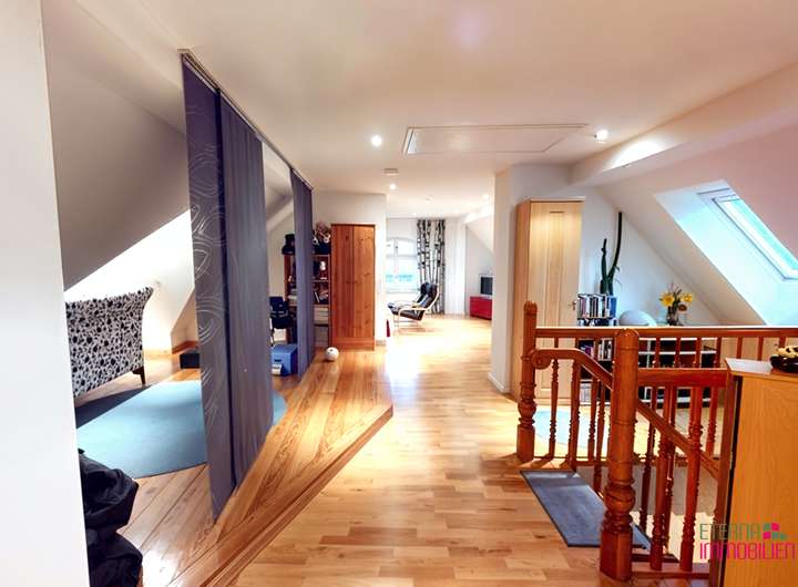 Über die eindrucksvolle Holztreppe gelangt man ins Obergeschoss, das eine elegante Wohnung beherbergt: