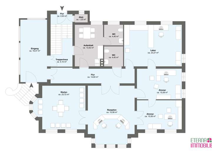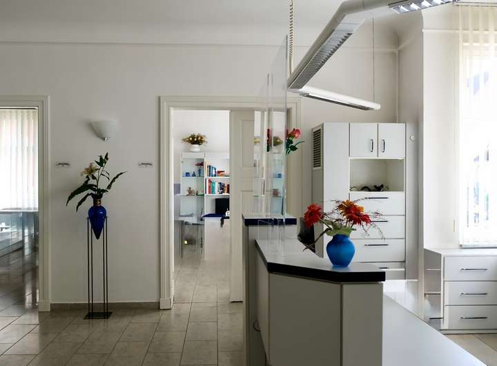 Das Hochparterre bietet ca. 114 m² Büro- bzw. Praxisräume, bestehend aus Empfang, drei Praxis- oder Büroräumen, Teeküche mit Aufenthaltsraum und Flur mit direktem Zugang zum Keller. Eine vorhandene Praxisausstattung kann auf Wunsch übernommen werden – perfekt für Kanzlei, Praxis oder kreative Tätigkeit.