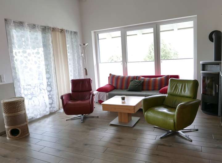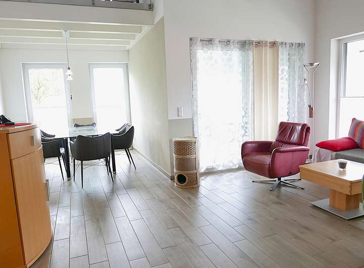 Das Wohlfühlzentrum bildet der bis zum First offene und großzügige Wohn- Essbereich mit großen Fensterflächen und einem Kaminofen für eine besondere Wärme in der kalten Jahreszeit.