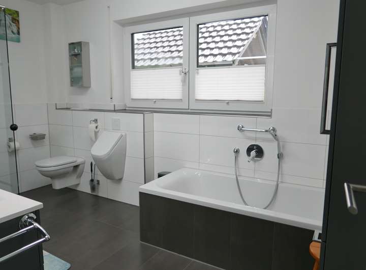 Waschbecken, große bodengleiche Dusche, Badewanne, WC, Urinal