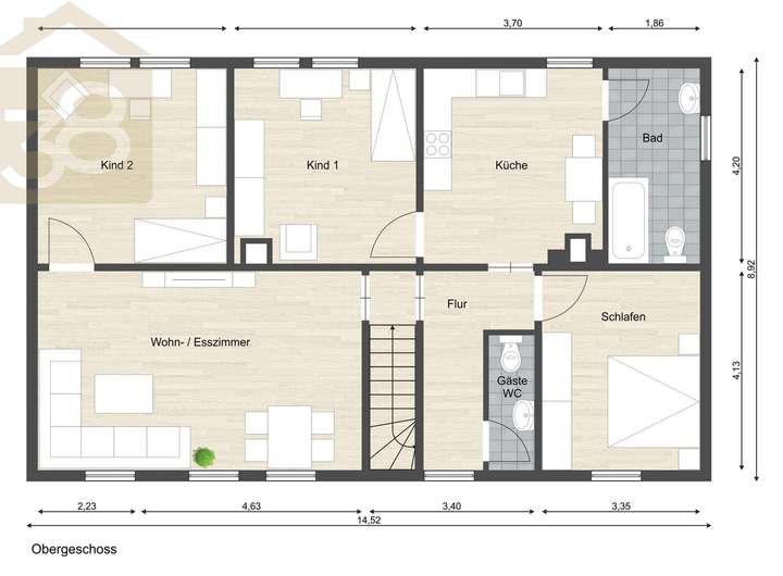 Im Obergeschoss erwartet Sie ebenfalls ein Wohnzimmer, zwei Schlafzimmer, ein Kinder-/Arbeitszimmer, eine separate Küche, die bereits mit einer Einbauküche ausgestattet ist, sowie ein Tageslichtbadezimmer mit Badewanne und WC. Ergänzend findet sich hier ein Gäste-WC.