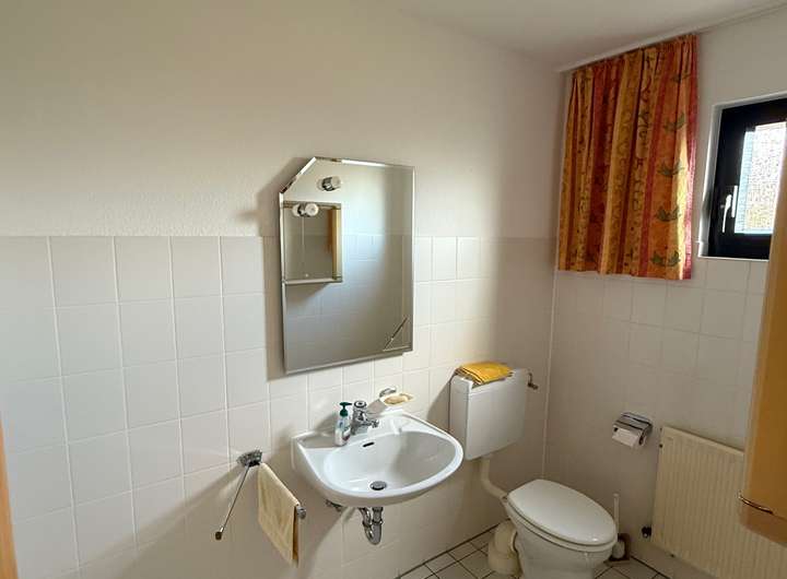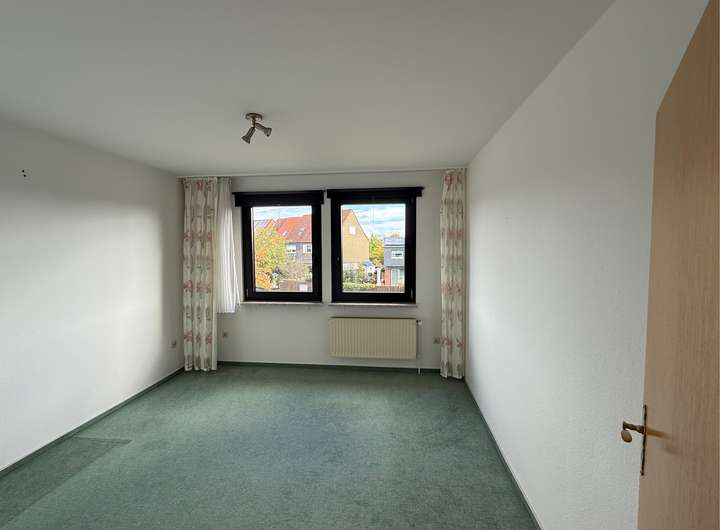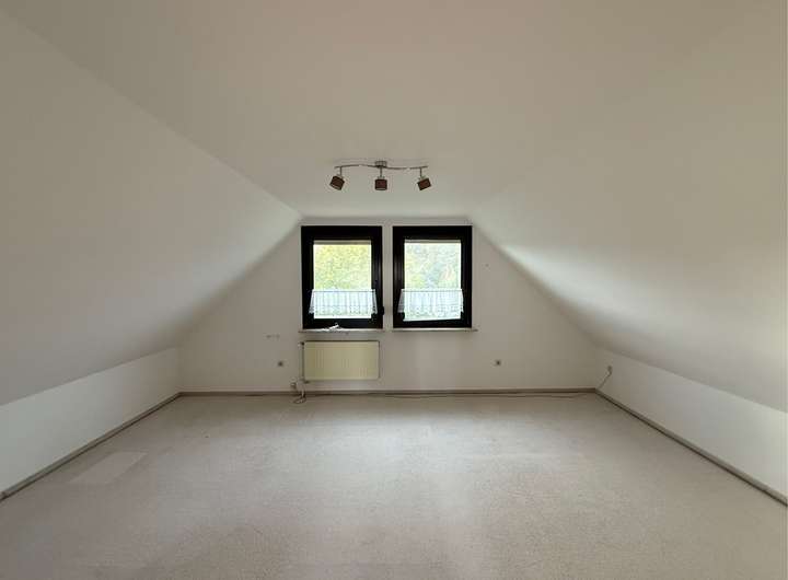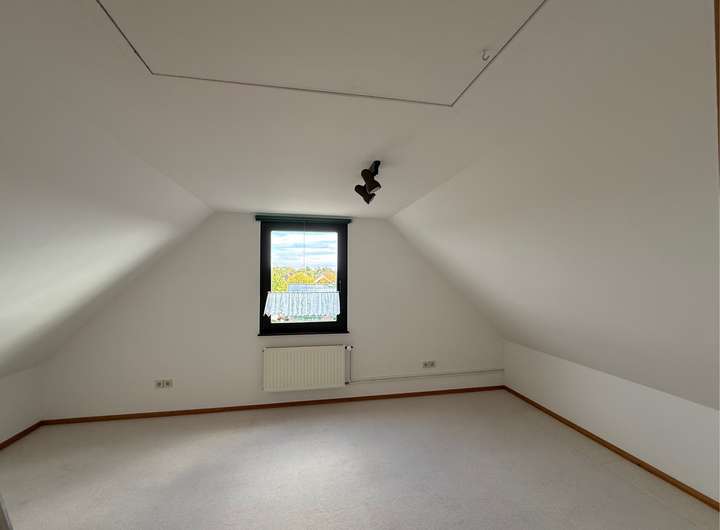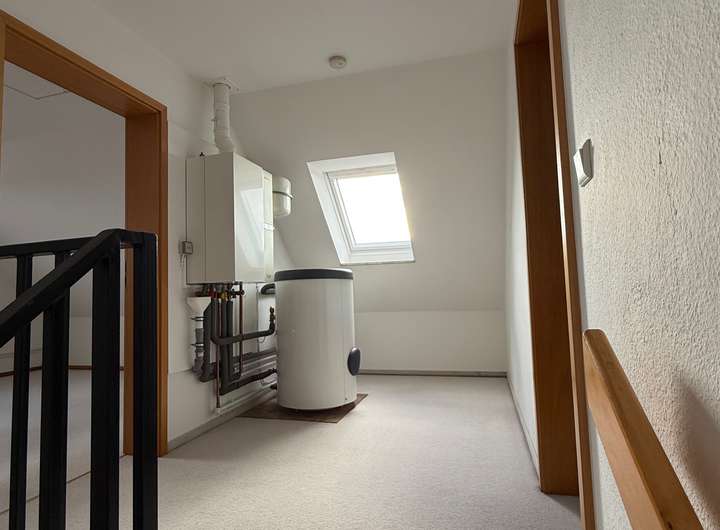 Im DG findet man zwei weitere Zimmer und die Gas-Heizung. Vor dem Haus ist Platz für ein Auto.