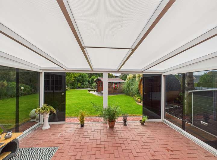 -neuwertiger Sommergarten mit rahmenlosen Ganzglasschiebetüren und abgedunkeltem Glas